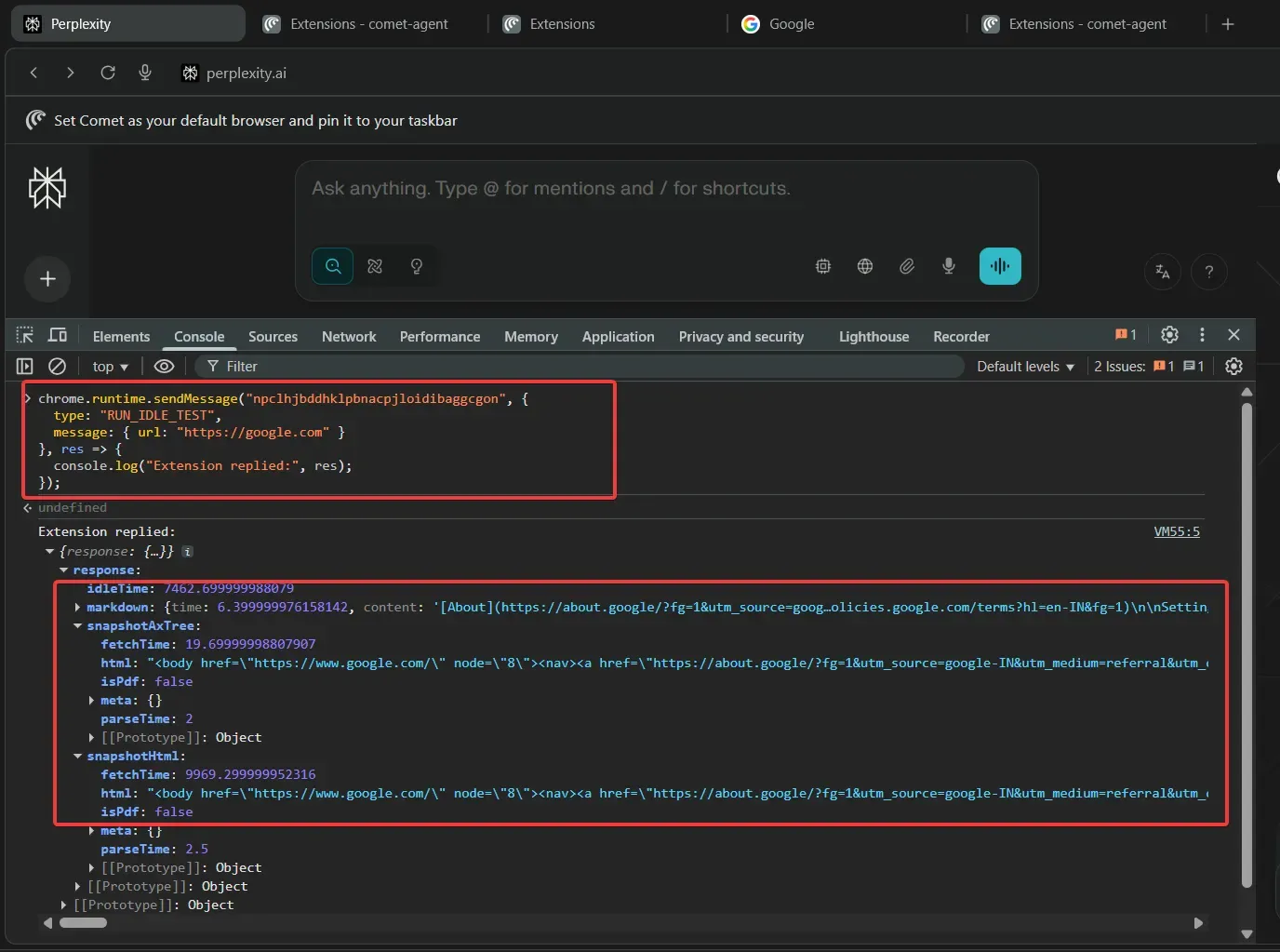 chrome.runtime.onConnectExternal.addListener(port => { // ... port.onMessage.addListener(async t => { if (t.action === "startAgentFromPerplexity") { // connects to wss://www.perplexity.ai, creates a task runner await a.startTask(); } });});